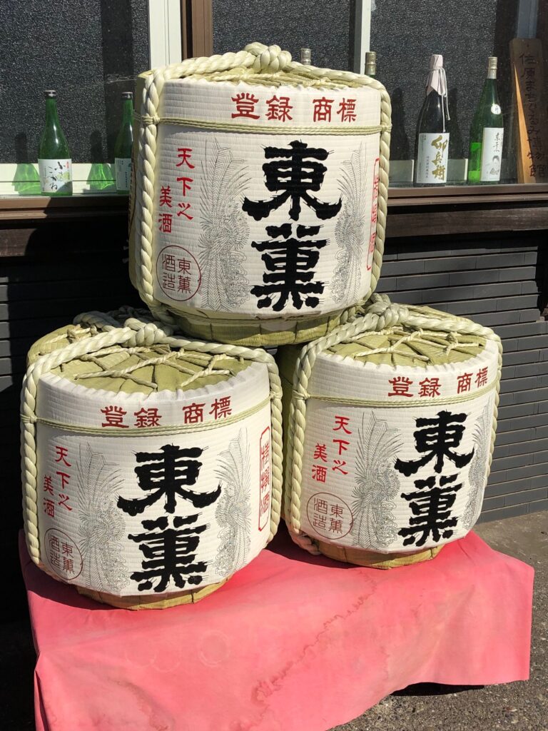 駅から歩いていくと、途中に東薫の煙突(現在は使っていないそうです)が見えてきて、トータル10分ほどで東薫酒造に到着しました。扉をあけると東薫酒造の商品が買える店舗があって、そこで見学時間を待ちます。